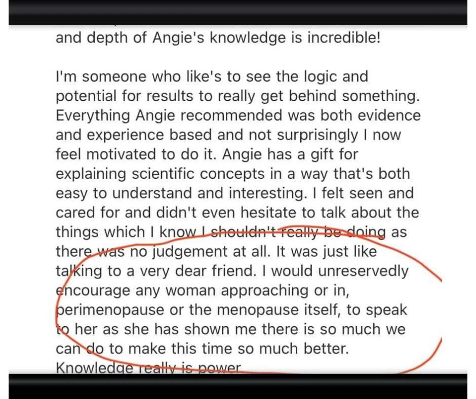 “Each session provided so much wisdom. Working with Angie felt like a real gift and I feel better equipped to embrace the next stage of my peri menopause journey.”